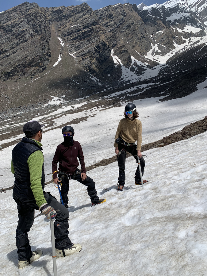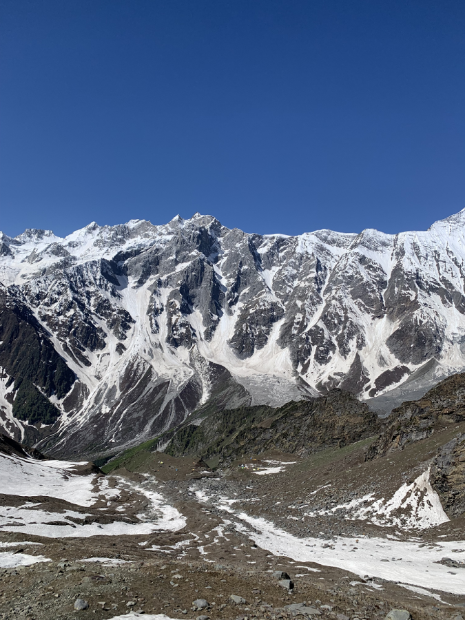 Today after breakfast leaving camp, the climb up is fairly steep to Base camp at Lady leg. The first glimpse of the Friendship peak we will have this day. Magnificent view of summits around Shitidhar, Ladakhi, Friendship peaks. A good trekker can climb these peaks by leaving Beas Kund early. The peaks above 6000m are Makerbeh and Shikhar Beh. Lahaul valley region lies to the north of Beas Kund just behind the great wall of these mountains. To the west Kangra and the lower region of Himalaya is known as the Dhauladhar range. Arrive base camp by lunchtime and after having a hot lunch at the camp. The rest of the afternoon is spent for an acclimatization walk and learning basic skills in ice and snow.
